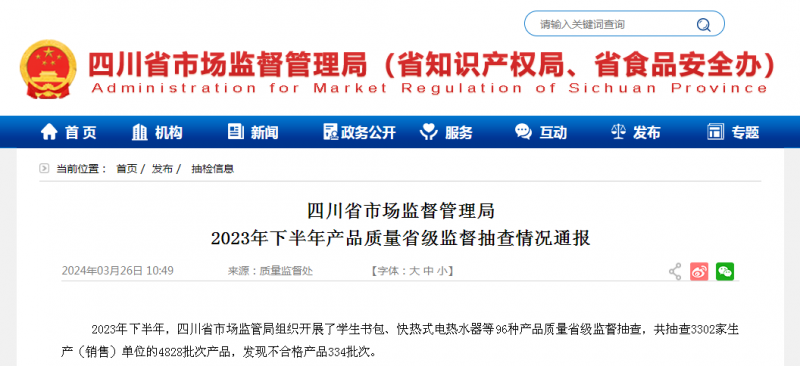 2023年下半年,四川省市場(chǎng)監(jiān)管局組織開(kāi)展了學(xué)生書(shū)包、快熱式電熱水器等96種產(chǎn)品質(zhì)量省級(jí)監(jiān)督抽查,共抽查3302家生產(chǎn)(銷售)單位的4828批次產(chǎn)品,發(fā)現(xiàn)不合格產(chǎn)品334批次。