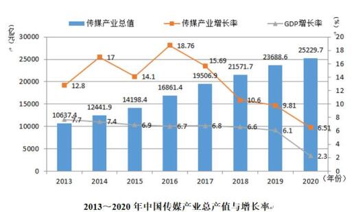 根據(jù)“傳媒藍皮書”課題組的統(tǒng)計,2000年中國傳媒產(chǎn)業(yè)總產(chǎn)值只有1500億元,2013年突破了1萬億元,2018年突破了2萬億元,2020年雖受疫情影響但依然正向增長根據(jù)“傳媒藍皮書”課題組的統(tǒng)計,2020年中國傳媒產(chǎn)業(yè)總產(chǎn)值達25229.7億元,同比增長6.51%,雖然增長率較2019年下跌3.3個百分點,但依然高于GDP增長率。傳媒細分領域呈現(xiàn)兩極化發(fā)展態(tài)勢,報刊、圖書、電影等傳統(tǒng)領域業(yè)務受疫情影響收入有所下降,但網(wǎng)絡視聽、網(wǎng)絡廣告、網(wǎng)絡游戲等互聯(lián)網(wǎng)業(yè)務在疫情背景下的“宅經(jīng)濟”中卻呈超常發(fā)展態(tài)勢。
