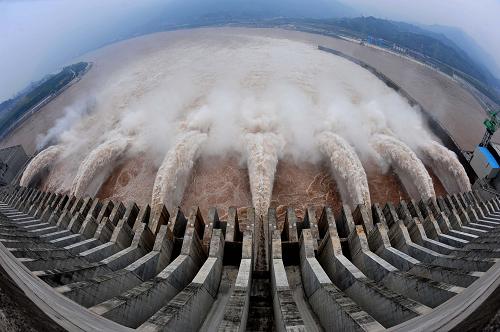2008年8月13日,長(zhǎng)江入汛以來(lái)的最大一次洪水順利通過(guò)三峽工程向中下游推進(jìn),中下游水位持續(xù)上漲,三峽工程運(yùn)行正常。2009年汛期,三峽水庫(kù)的防洪庫(kù)容已達(dá)146億立方米,開(kāi)始發(fā)揮攔洪調(diào)峰和枯水期給下游補(bǔ)水的功能,下游荊江河段防洪標(biāo)準(zhǔn)已從十年一遇提高到了近百年一遇,長(zhǎng)江中下游的防洪體系初步形成。新華社記者杜華舉攝