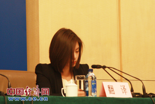 十二屆全國(guó)人大一次會(huì)議新聞中心3月14日(星期四)下午3時(shí)在梅地亞中心多功能廳舉行主題為“醫(yī)藥衛(wèi)生體制改革”的記者會(huì)。圖為記者會(huì)女翻譯。中國(guó)經(jīng)濟(jì)網(wǎng) 秦宇雯 攝影