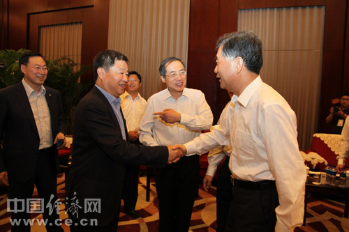 6月17日,以“社會(huì)共治、同心攜手維護(hù)食品安全”為主題的2013年全國(guó)食品安全宣傳周主場(chǎng)活動(dòng)在北京舉行。國(guó)務(wù)院副總理汪洋出席活動(dòng)并講話。圖為國(guó)務(wù)院副總理汪洋和中糧集團(tuán)董事長(zhǎng)寧高寧交流。 中國(guó)經(jīng)濟(jì)網(wǎng) 王耀峰/攝