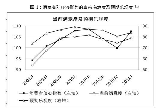 2011年一季度中國(guó)消費(fèi)者信心指數(shù)為108,比2010年四季度大幅上升8點(diǎn),接近近兩年高點(diǎn)。消費(fèi)者對(duì)當(dāng)前經(jīng)濟(jì)形勢(shì)的滿意度和對(duì)未來經(jīng)濟(jì)走勢(shì)的預(yù)期樂觀度均明顯上升,持樂觀態(tài)度的消費(fèi)者比重均接近兩年內(nèi)的最高點(diǎn)。