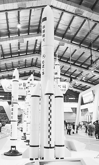 長(zhǎng)征五號(hào)運(yùn)載火箭模型。長(zhǎng)征五號(hào)系列運(yùn)載火箭是我國(guó)新一代大型運(yùn)載火箭。以CZ—5E為例,其為兩級(jí)狀態(tài)火箭,芯級(jí)直徑5米,捆綁 4個(gè)3.35米直徑的助推器,起飛質(zhì)量856噸,計(jì)劃2014年實(shí)現(xiàn)首飛。CZ—5E火箭已初步被確定為用于月球表面采樣和返回任務(wù)用火箭。